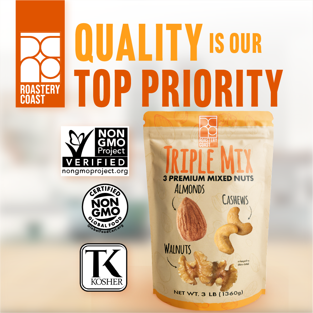The roasted ingredients are dry-roasted in-house in small-batches at our California Roastery. Small-batch roasting ensures a higher quality roast. Dry-roasting ensures delicious nutty flavor without the use of oils.